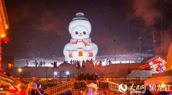 作为雪乡冬季文旅矩阵的核心亮点之一,这座大雪人延续了经典的林区小女孩形象,将东北民俗与冰雪雕刻艺术精妙融合。雪人头顶戴着一顶缀满毛绒雪花装饰的东北大花帽,脖颈间围着厚实的红色围巾,在皑皑白雪的映衬下显得格外醒目。手捧着红彤彤的冻柿子,寓意着新的一年“事事如意”,与雪乡银装素裹的冬日景观相映成趣。