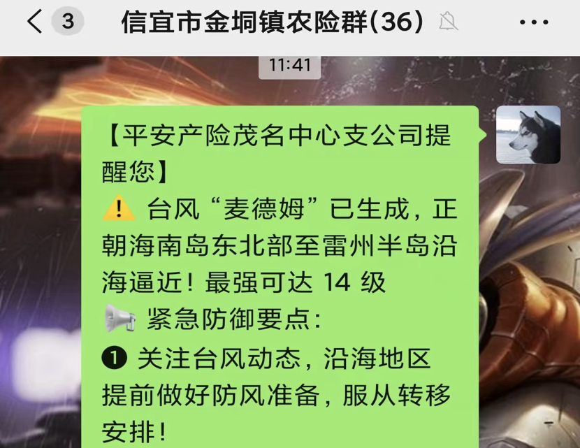 农险服务深入田间:依托覆盖27个乡镇的农险服务群,持续发布台风路径与防灾指南;对电白区20余家林场实施一对一风险提醒,累计覆盖农户约4000人次,确保节假日期间农业防灾不留盲区。